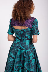 The Ayo midaxi Adara print dress is mix print V neck ,six pieces dress with a short Sleeve and buttons in front. It is hand dyed by local artisans in Lagos , Nigeria.