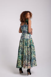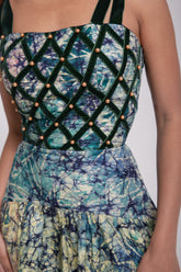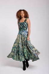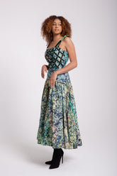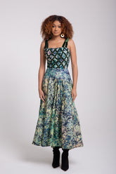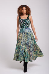 THE ITUNU MIDI DRESS IS a fit and flare dress with an intricately stitched velvet basket design on the upper bodice with faux pearl beads.